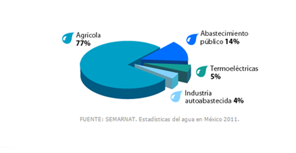 En México, 77% del agua se utiliza en la agricultura;14%, en el abastecimiento público; 5% en las termoeléctricas y 4% en la industria.